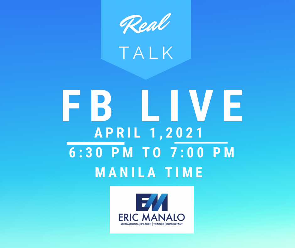 Real Talk with Eric Manalo Thursday, April 1, 2021 6:30 PM 7:00 PM 18:30 19:00 Google Calendar ICS Due to the request of my FB friends not familiar with using zoom, I have decided to go FB live tomorrow to share insights and try to answer questions you have. We all need to encourage one another. Talk to you tomorrow. My FB page coachericmanalo